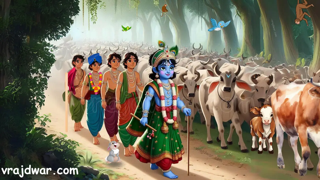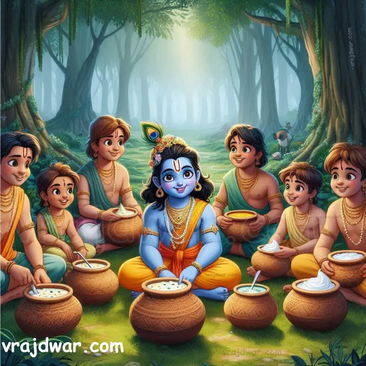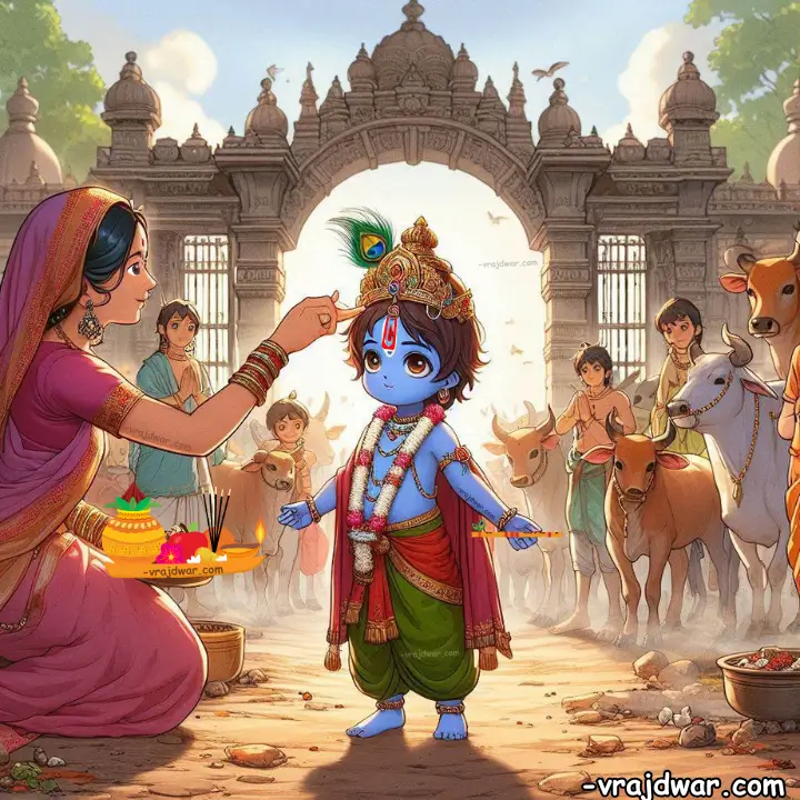 She imparted teachings: do not venture into the jungle or water bodies, do not quarrel with friends, and eat on time. She also instructed Balram and Shridama to look after Kanhaiya. “Do not leave him alone, or he might lose his way and get lost in the jungle. Ensure he eats at regular intervals.”